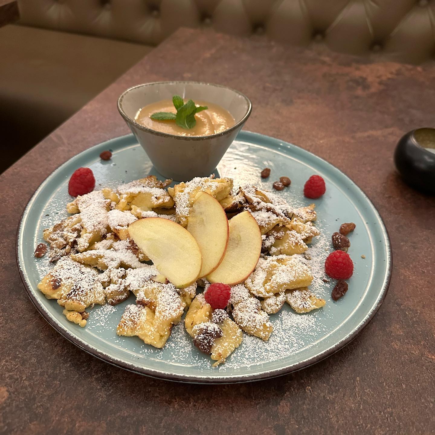 Kaiserschmarrn mit Apfelmus und Beeren im gemütlichen Restaurant moritz Burger 'n Steaks.